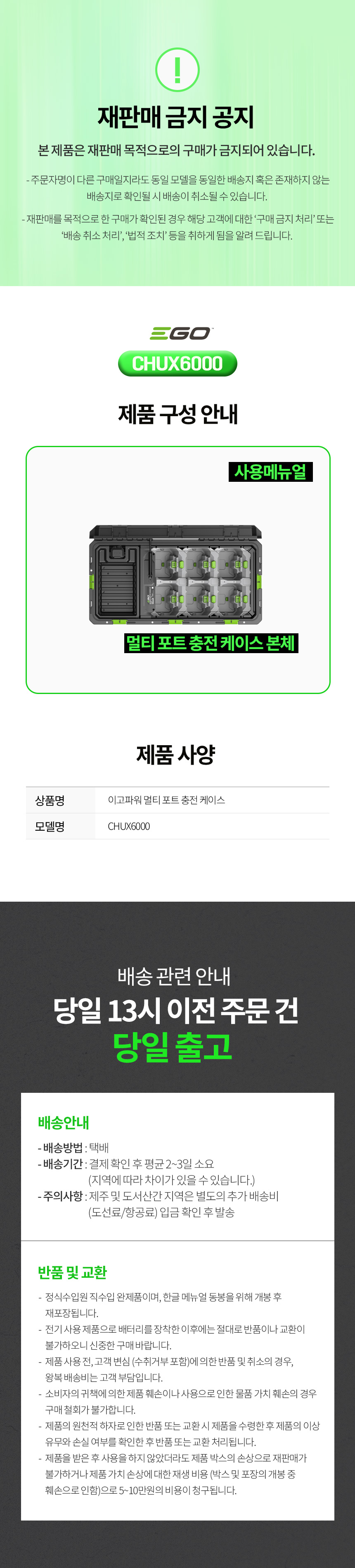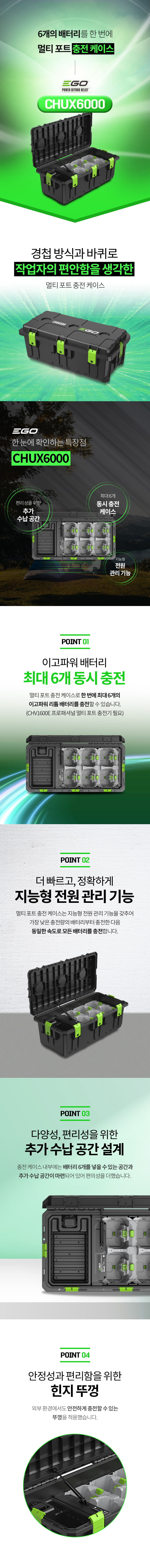 이 케이스는 EGO CHV1600E 전문가용 멀티포트 충전기와 직접 사용하거나, EGO 550W 급속 충전기와 ACA1000 EGO 충전 어댑터를 함께 사용하여 연결할 수도 있습니다. 케이스 내부에는 6개의 배터리를 넣을 수 있는 공간과 추가 수납 공간이 마련되어 있습니다.